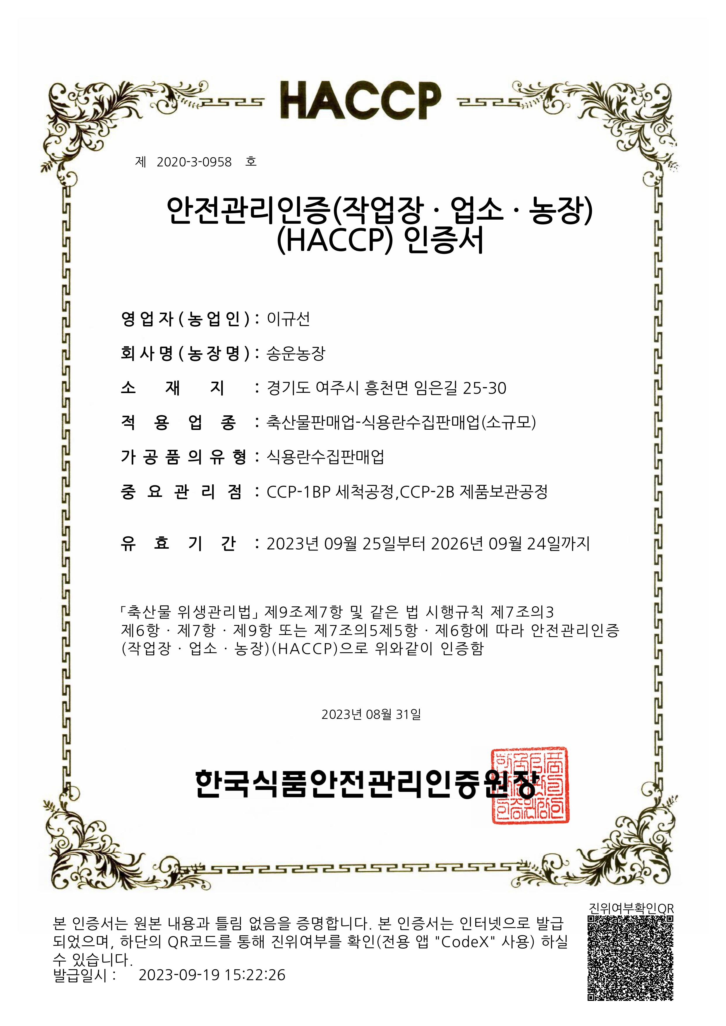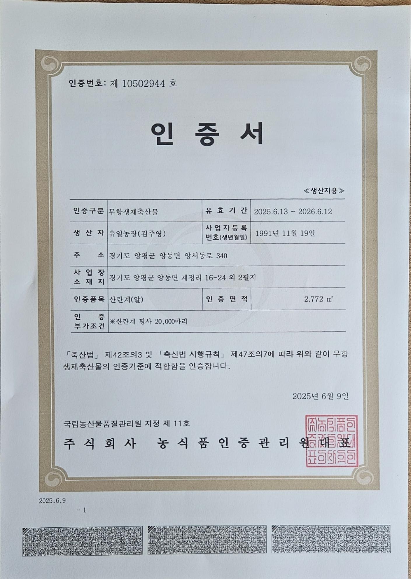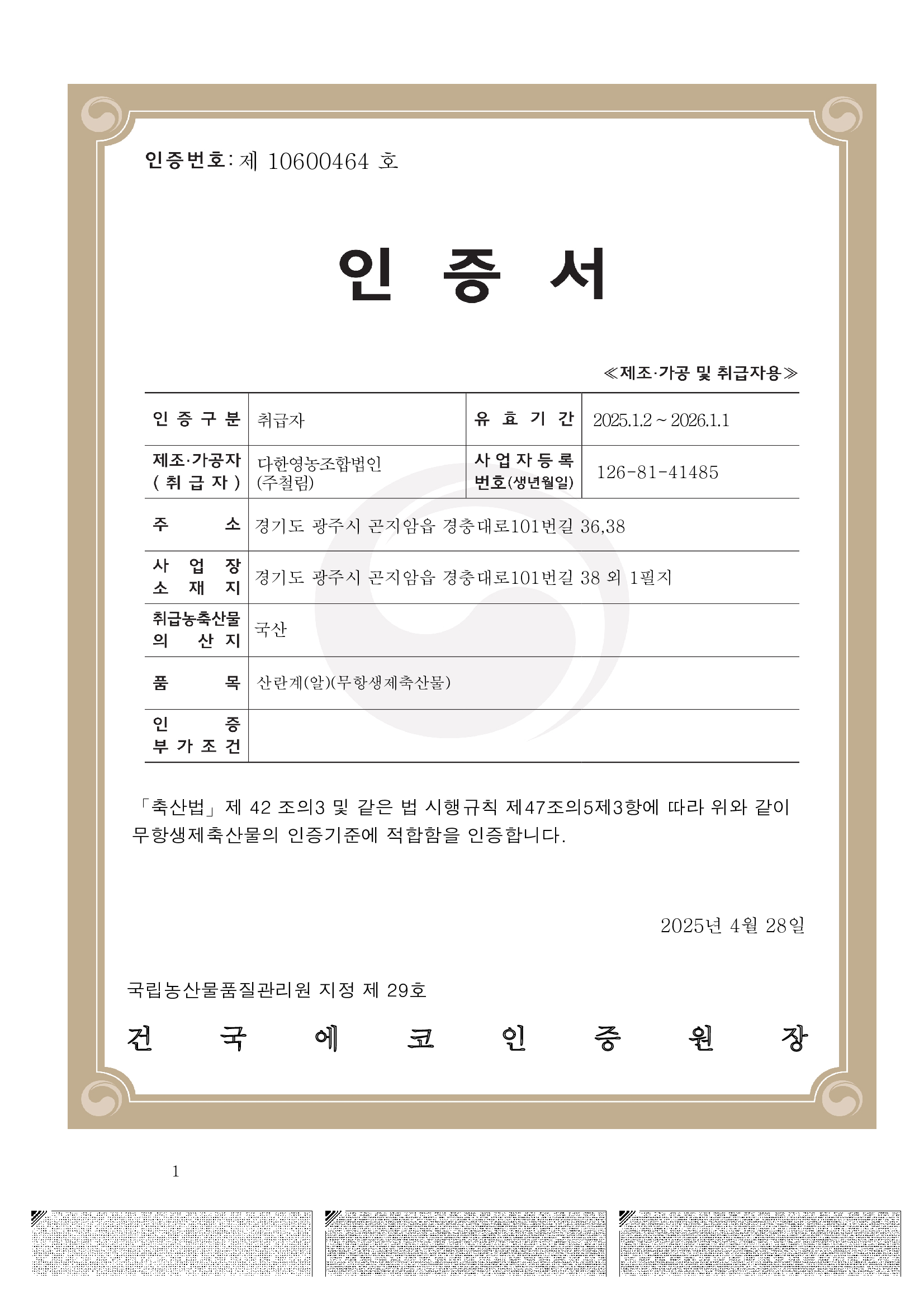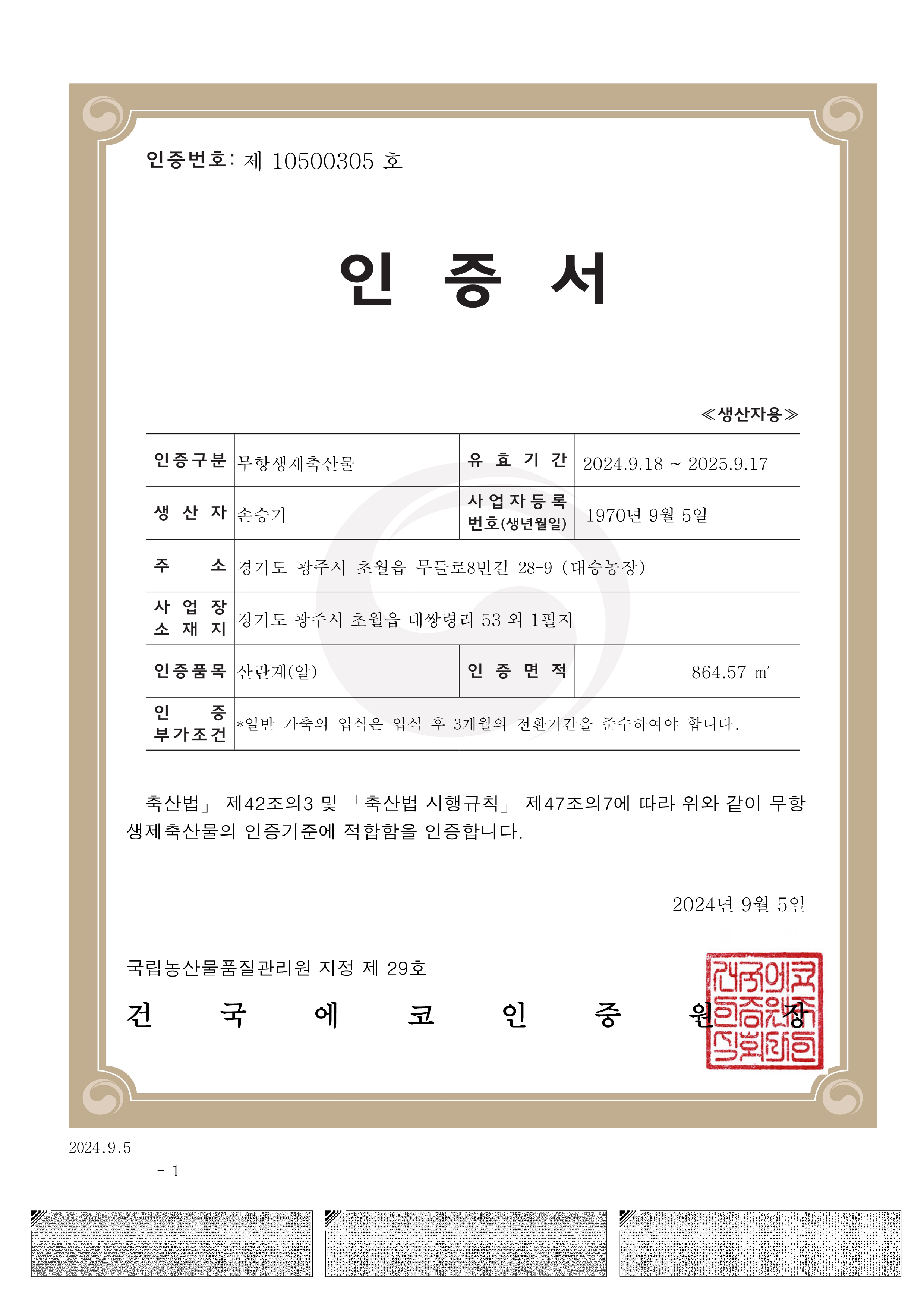 무항생제인증 무항생제 축산물 인증서(GP) 가온농장 갈미농장 길샘농장 대승농장 송오농장 양지뜰농장 영일농장 함일농장 유일농장(협력) 송운농장(협력) 자연알로 서천(협력) HACCP인증 HACCP(GP) 가온농장 갈미농장 길샘농장 대승농장 송오농장 양지뜰농장 영일농장 함일농장 유일농장(협력) 송운농장(협력) 동물복지인증 유일농장(협력) 송운농장(협력) 자연알로 서천(협력) 우수인증 및 수상내역 경기도 우수식품 인증서 소비자시민모임 우수 축산물 브랜드 인증서