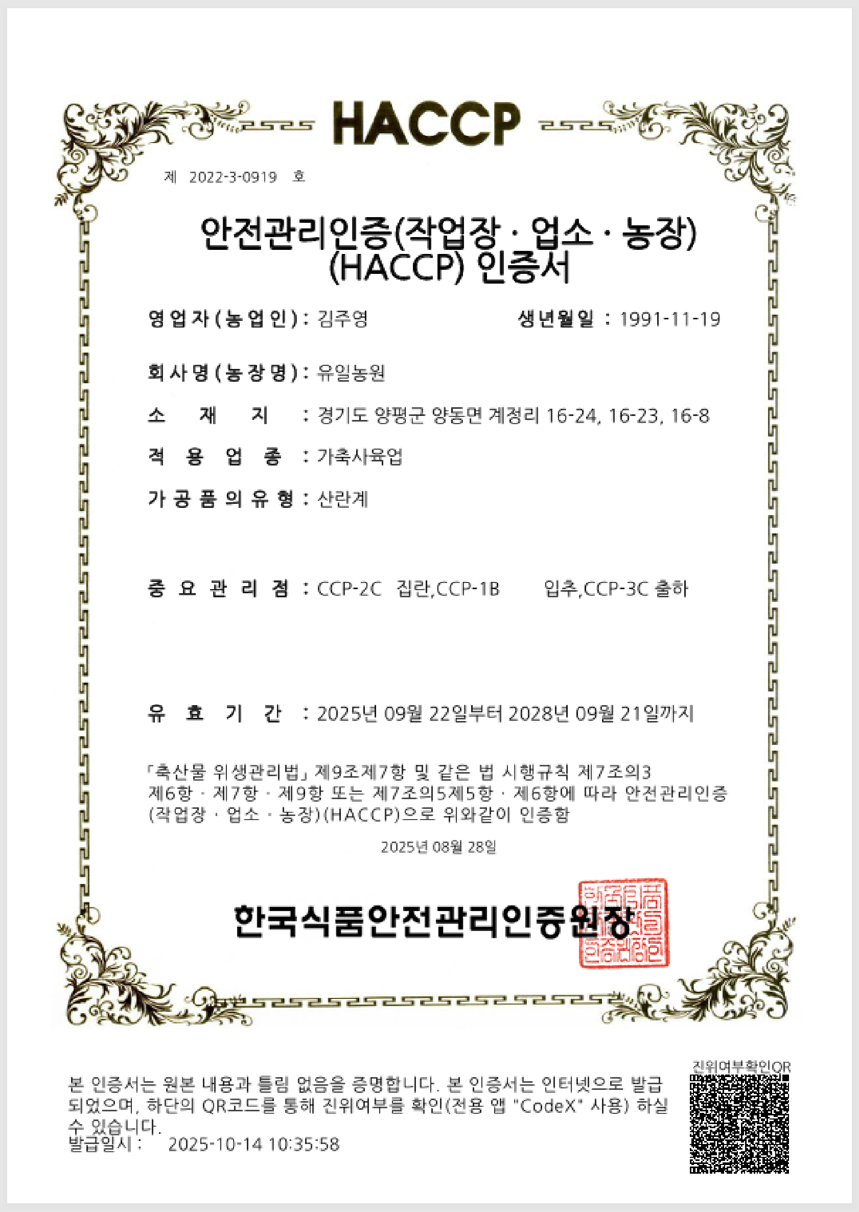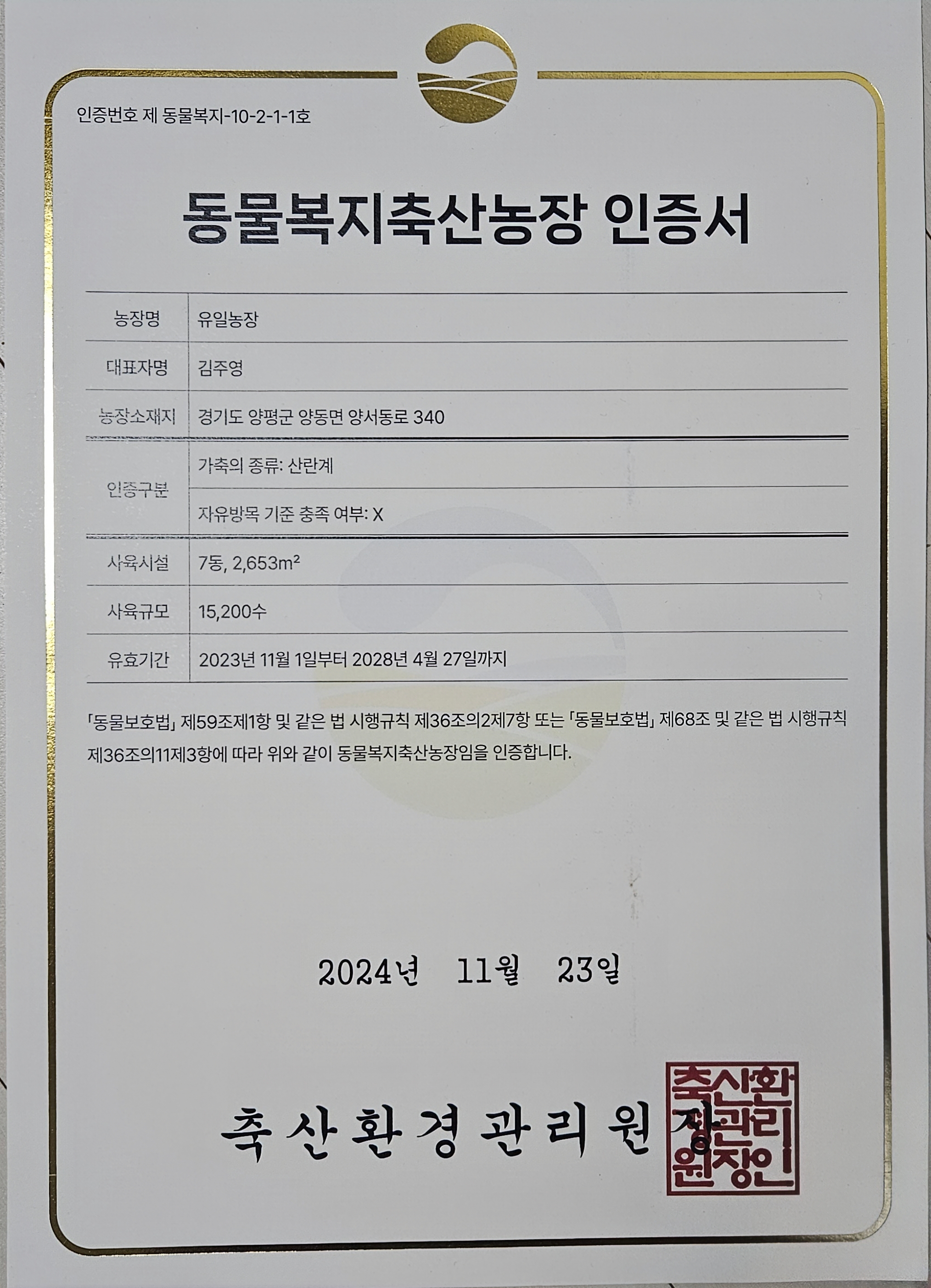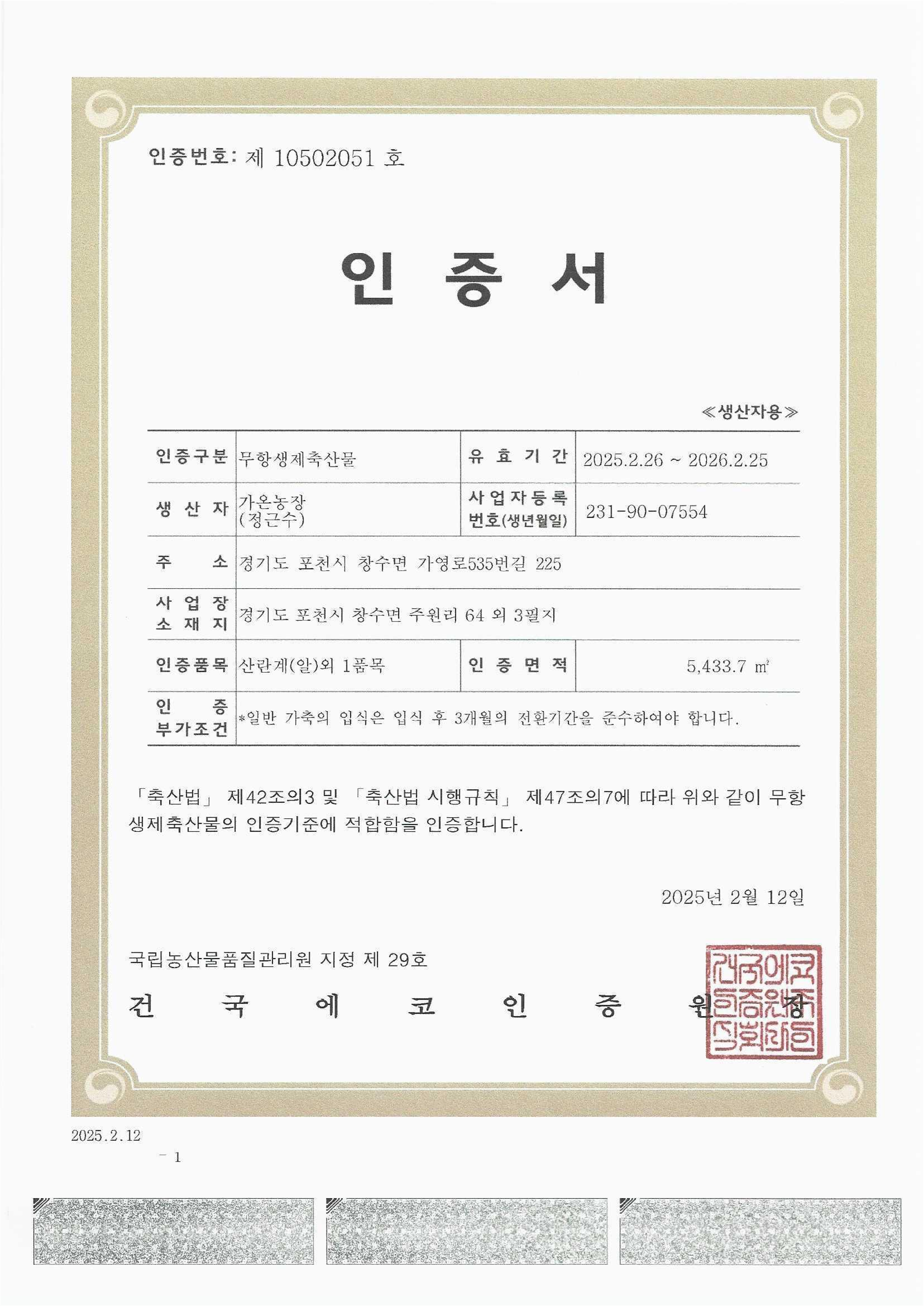 무항생제인증 무항생제 축산물 인증서(GP) 가온농장 갈미농장 길샘농장 대승농장 송오농장 양지뜰농장 영일농장 함일농장 유일농장(협력) 송운농장(협력) 자연알로 서천(협력) HACCP인증 HACCP(GP) 가온농장 갈미농장 길샘농장 대승농장 송오농장 양지뜰농장 영일농장 함일농장 유일농장(협력) 송운농장(협력) 동물복지인증 유일농장(협력) 송운농장(협력) 자연알로 서천(협력) 우수인증 및 수상내역 경기도 우수식품 인증서 소비자시민모임 우수 축산물 브랜드 인증서