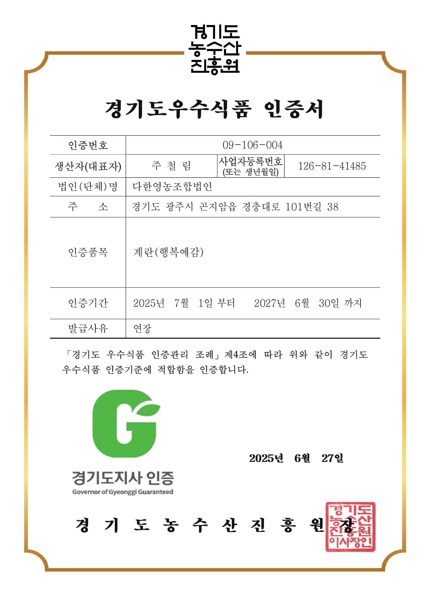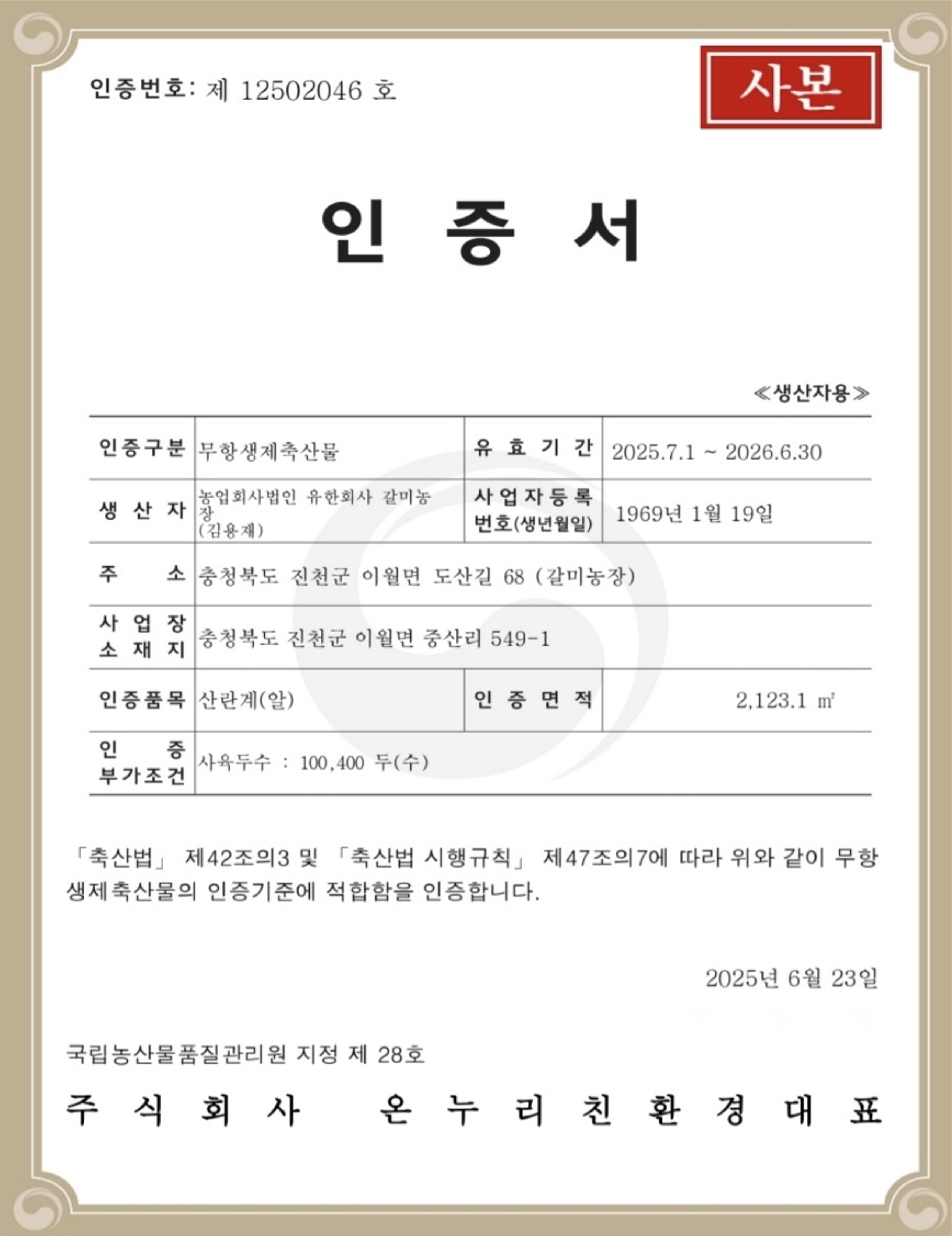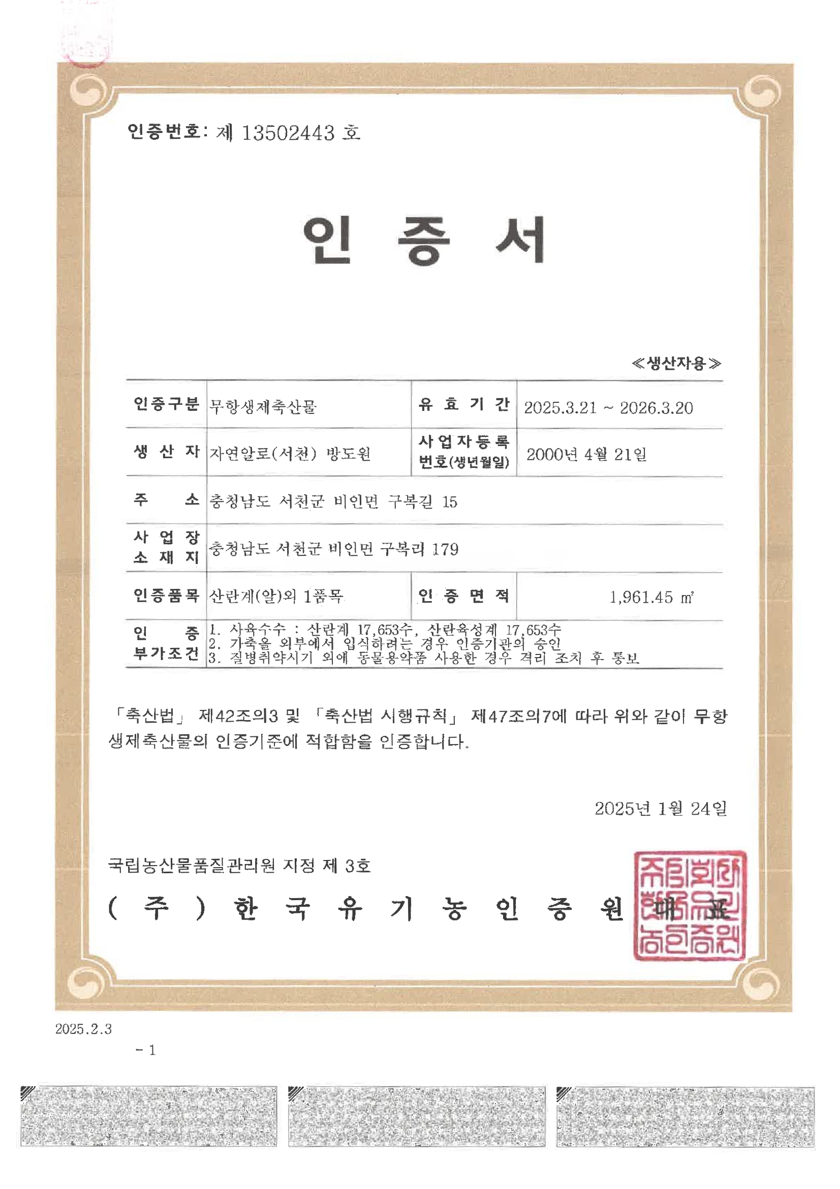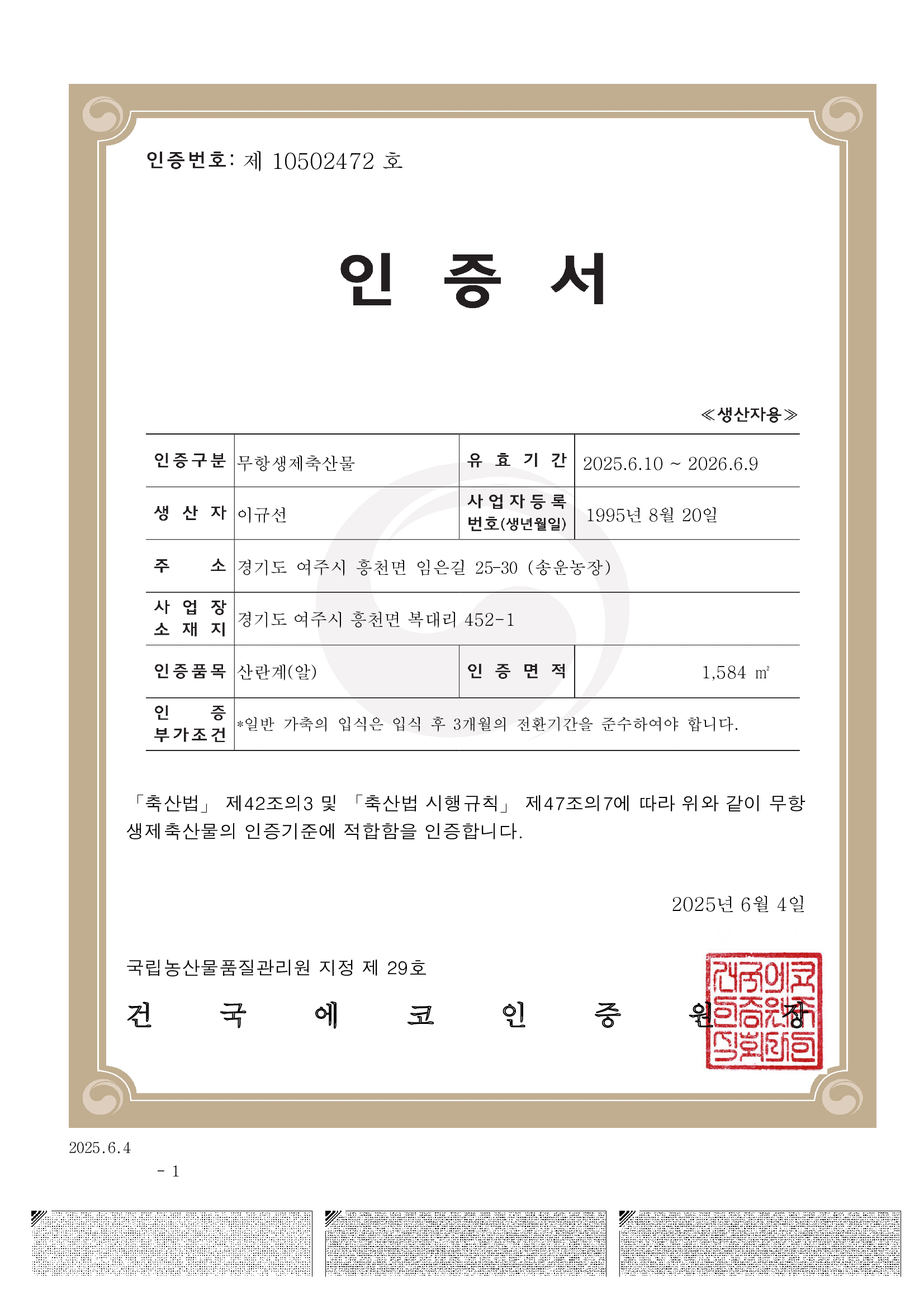 무항생제인증 무항생제 축산물 인증서(GP) 가온농장 갈미농장 길샘농장 대승농장 송오농장 양지뜰농장 영일농장 함일농장 유일농장(협력) 송운농장(협력) 자연알로 서천(협력) HACCP인증 HACCP(GP) 가온농장 갈미농장 길샘농장 대승농장 송오농장 양지뜰농장 영일농장 함일농장 유일농장(협력) 송운농장(협력) 동물복지인증 유일농장(협력) 송운농장(협력) 자연알로 서천(협력) 우수인증 및 수상내역 경기도 우수식품 인증서 소비자시민모임 우수 축산물 브랜드 인증서